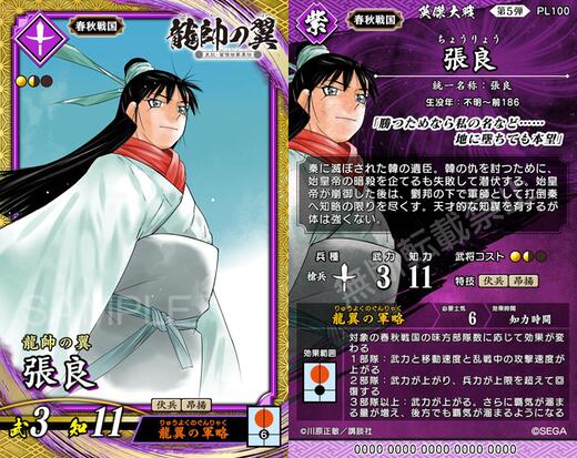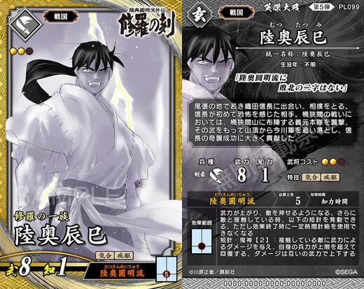 『川原正敏作品』より武将として、本コラボのために描かれた「SR劉備」、漫画『修羅の刻』より「SR陸奥辰巳」、漫画『龍帥の翼』より「SR張良」が登場します。