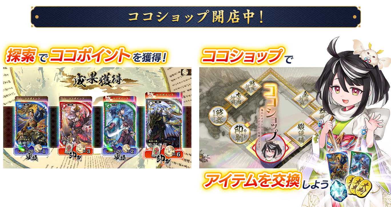 開催期間中は、探索で武将を変換・保管・印刷するたびにココポイントを獲得でき、サテライトでココショップが開店します!