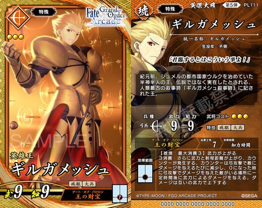 『Fate/Grand Order Arcade』より、武将「SRレオナルド・ダ・ヴィンチ(ライダー)」「SRアルトリア・ペンドラゴン(セイバー)」「SRギルガメッシュ(アーチャー)」「SRモルガン」が登場します。